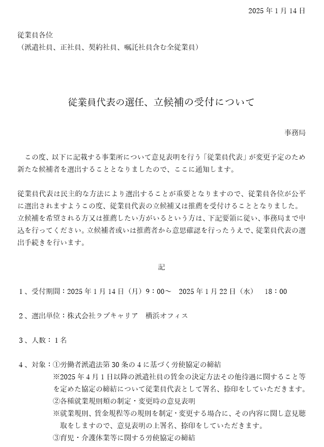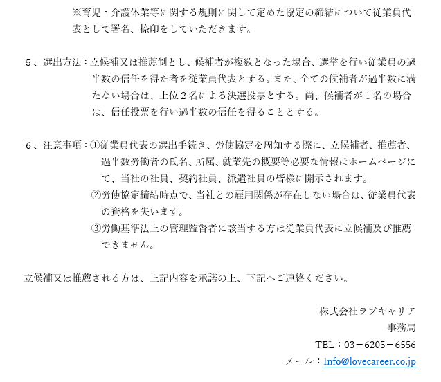 従業員代表の選任、立候補の受付について@ラブキャリア管理本部
