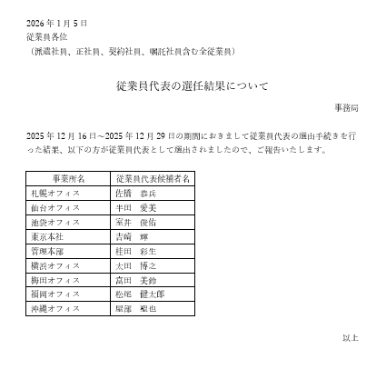 2025年12月16⽇〜12月29日の期間におきまして従業員代表の選出手続きを行った結果、以下の方が従業員代表として選出されましたので、ご報告いたします。